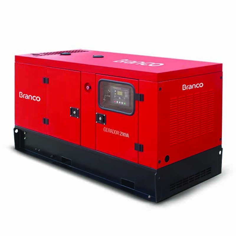 Gerador cabinado indicado para pequenos e médios estabelecimentos comerciais, como restaurantes e escritórios, equipado com motor a diesel de 4 cilindros com 42 cvs refrigerador a água, potência máxima contínua 21 KW.