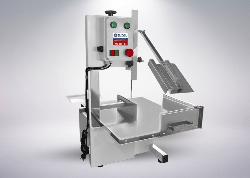 Serra fira para carne possuindo quadro de comando, com botão de reset, botão de emergência, botão liga/desliga de duplo acionamento, chave geral; proteções mecânicas para lâmina, proteção pendular para lâmina, empurrador direito, esquerdo e frontal. Possui também mesa móvel.