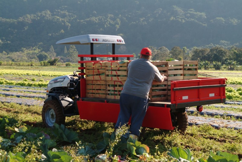 Trator Agrale modelo Cargo 4230.4, motor de 30cvs de potência de 2 cilindros, tração 4x4, direção hidrostática, equipado com carreta para carga de 1.200kgs.
